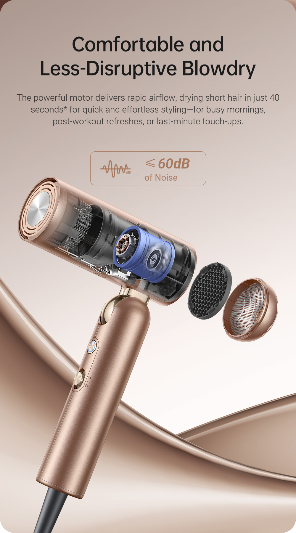 The high-speed motor generates fast concentrated airflow to dry hair quicker while reducing heat exposure. Short hair can dry in ~40 seconds. Perfect for busy mornings, gym-to-office transitions, and fast travel routines.